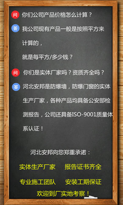 河北安邦安防是資質齊全的防爆墻廠家,我公司擁有公安部核發的防爆墻檢測報告、ISO-9001質量體系認證。